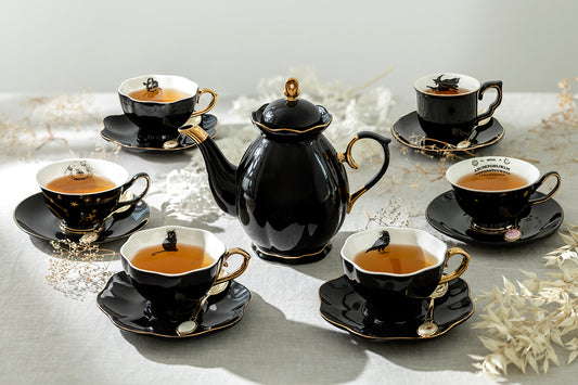 Black Gold Scallop Teapot + 6 Assorted Halloween Tea Cup and Saucer Sets - Ver. A