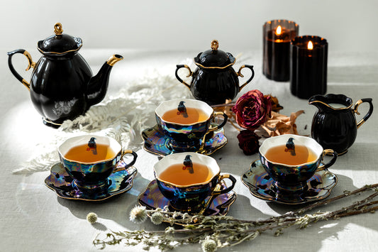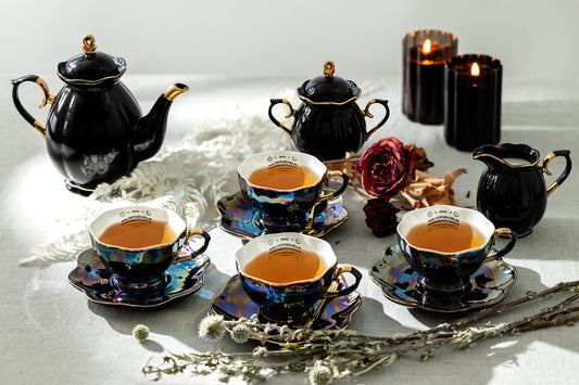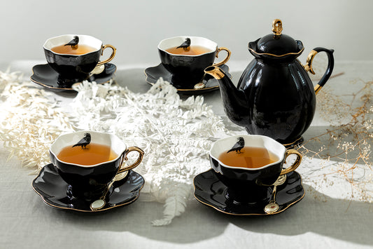 Black Gold Scallop Teapot + Raven Tea Cup and Saucer Sets