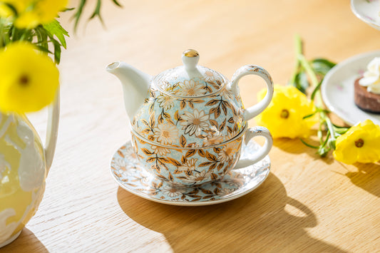 Blue & Gold Daisy Fine Porcelain Tea For One Set with Pink Gift Box