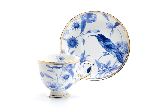 Blue Spring Flowers with Hummingbird Fine Porcelain Tea Cup and Saucer