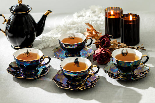 4 Assorted Halloween Tea Cup and Saucer Sets - Raven, Cat, Snake, Spider