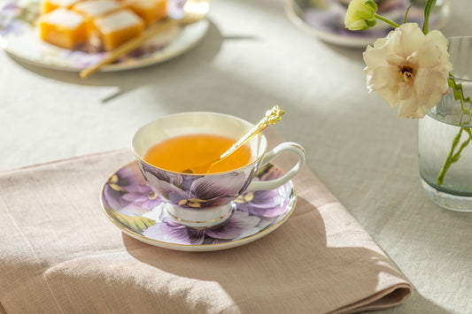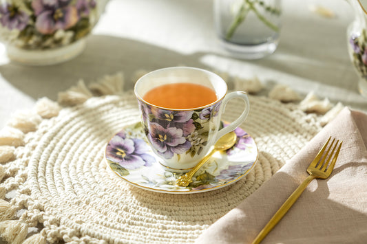 Purple Gold Pansy Bone China Tea Cup and Saucer