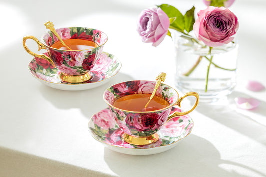 Red Rose Gold Dots Bone China Tea Cup and Saucer