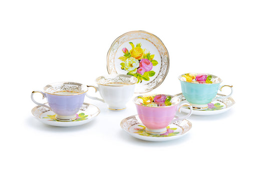 Rose Bouquet Assorted Colors Fine Porcelain Tea Cup and Saucer Set of 4