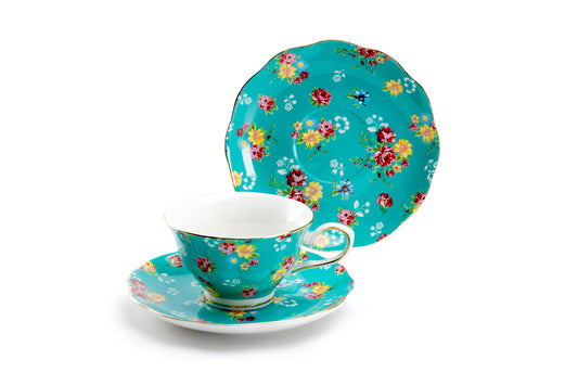 Turquoise Shabby Rose Fine Porcelain Tea Cup and Saucer