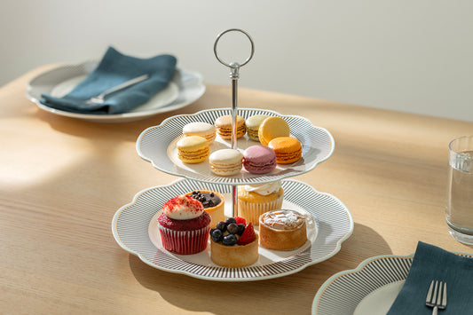 Dark Gray Stripes with Gold Dots Scallop Fine Porcelain 2-Tier Server