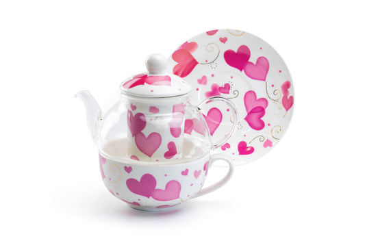 Pink Hearts Glass and Fine Porcelain Tea For One Set