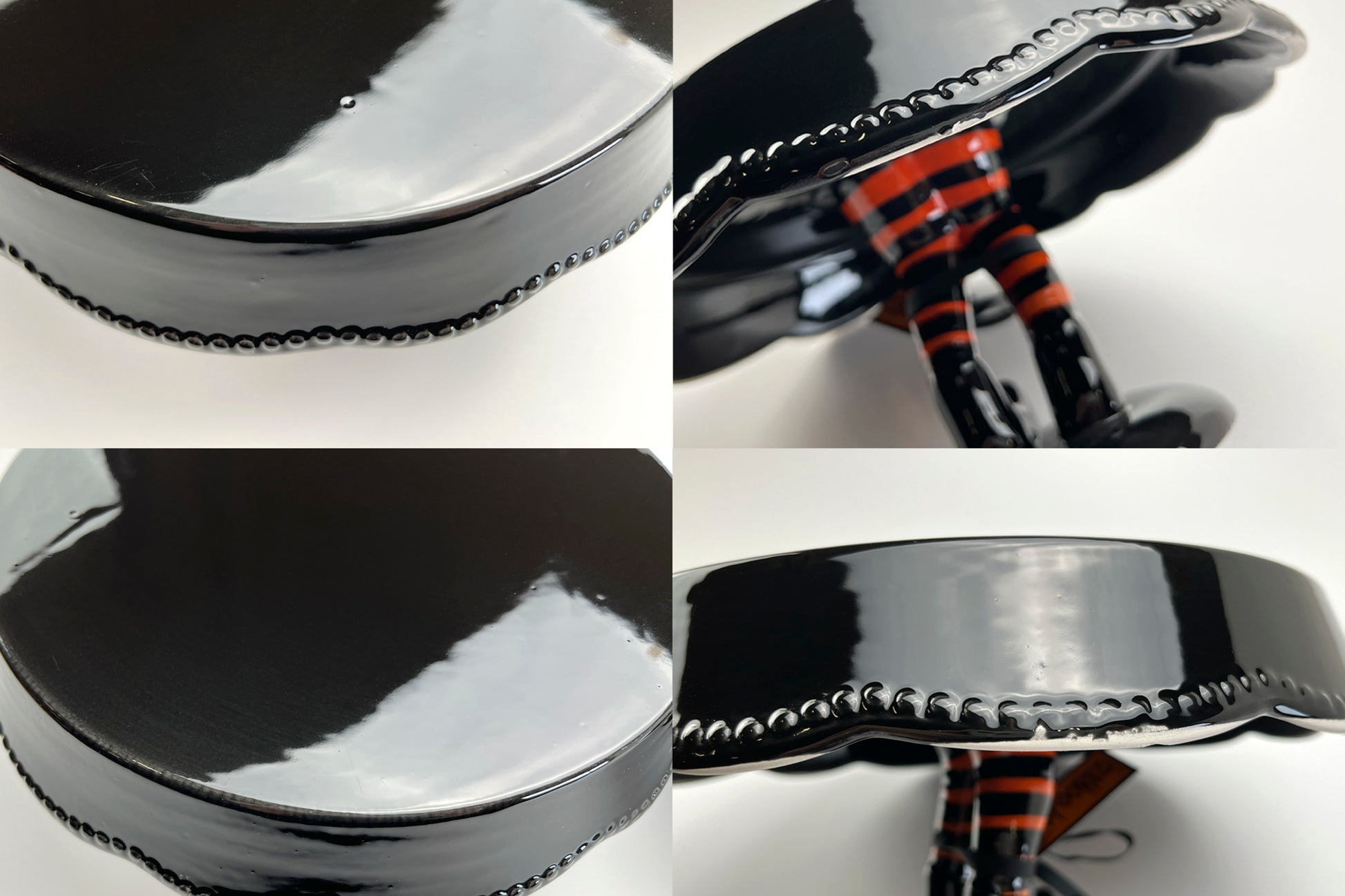 Due to the intricate crafting process, this cake stand exhibits noticeable imperfections, including slight slant in some pieces, visible brush strokes, small air bubbles on the surface, and uneven paint along certain edges. Despite these flaws, it remains a charming, uniquely designed product that pairs beautifully with the Witch's Cauldron teapot, making it a delightful addition to your Halloween collection.