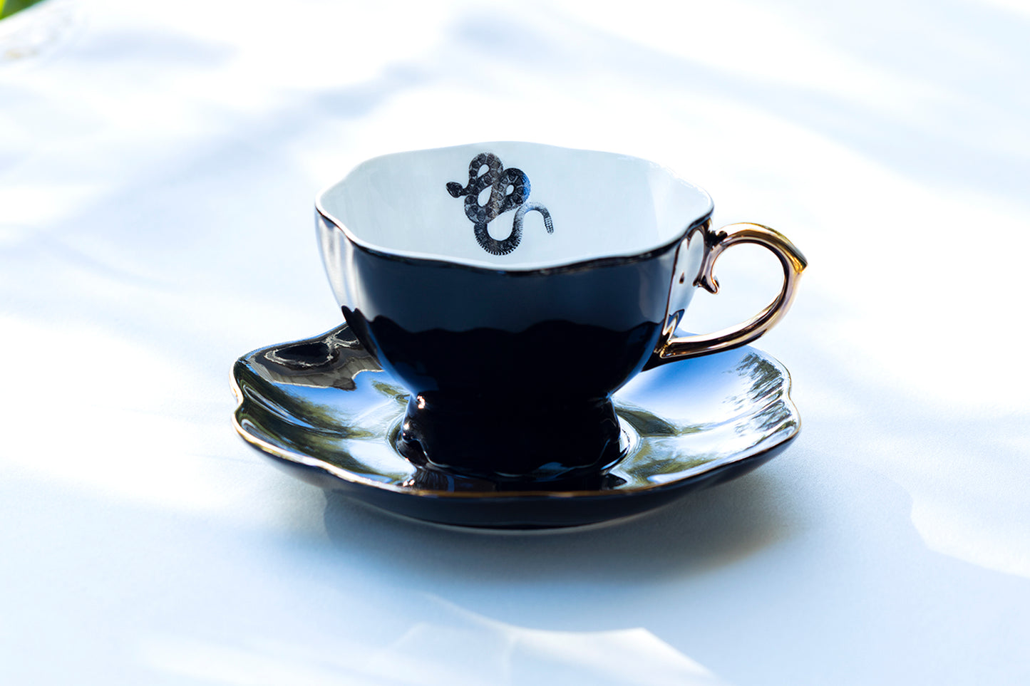 This set includes - 4 Assorted Halloween Tea Cup and Saucer Sets (Cat, Raven, Snake, Flying Witch - one of each)