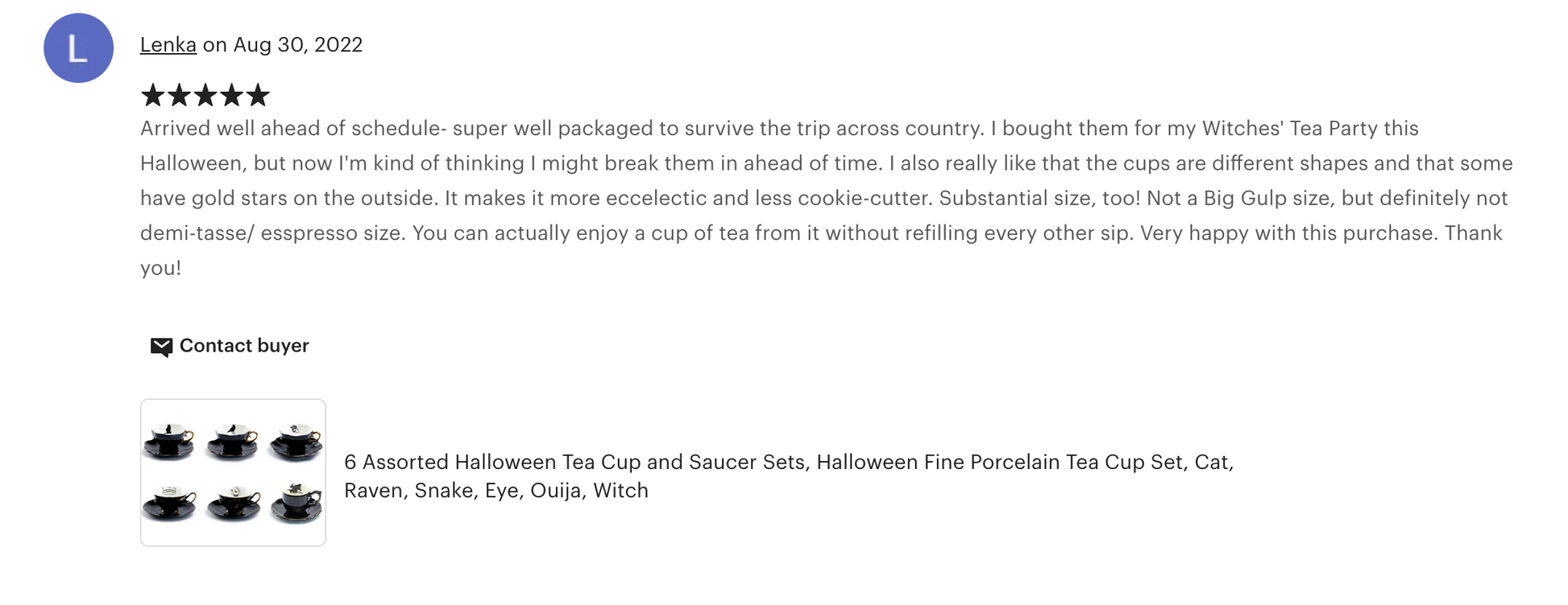 This set includes - 6 Assorted Halloween Tea Cup and Saucer Sets (Cat, Raven, Snake, Ouija Board, Witchy Crystal Ball, Flying Witch - one of each)