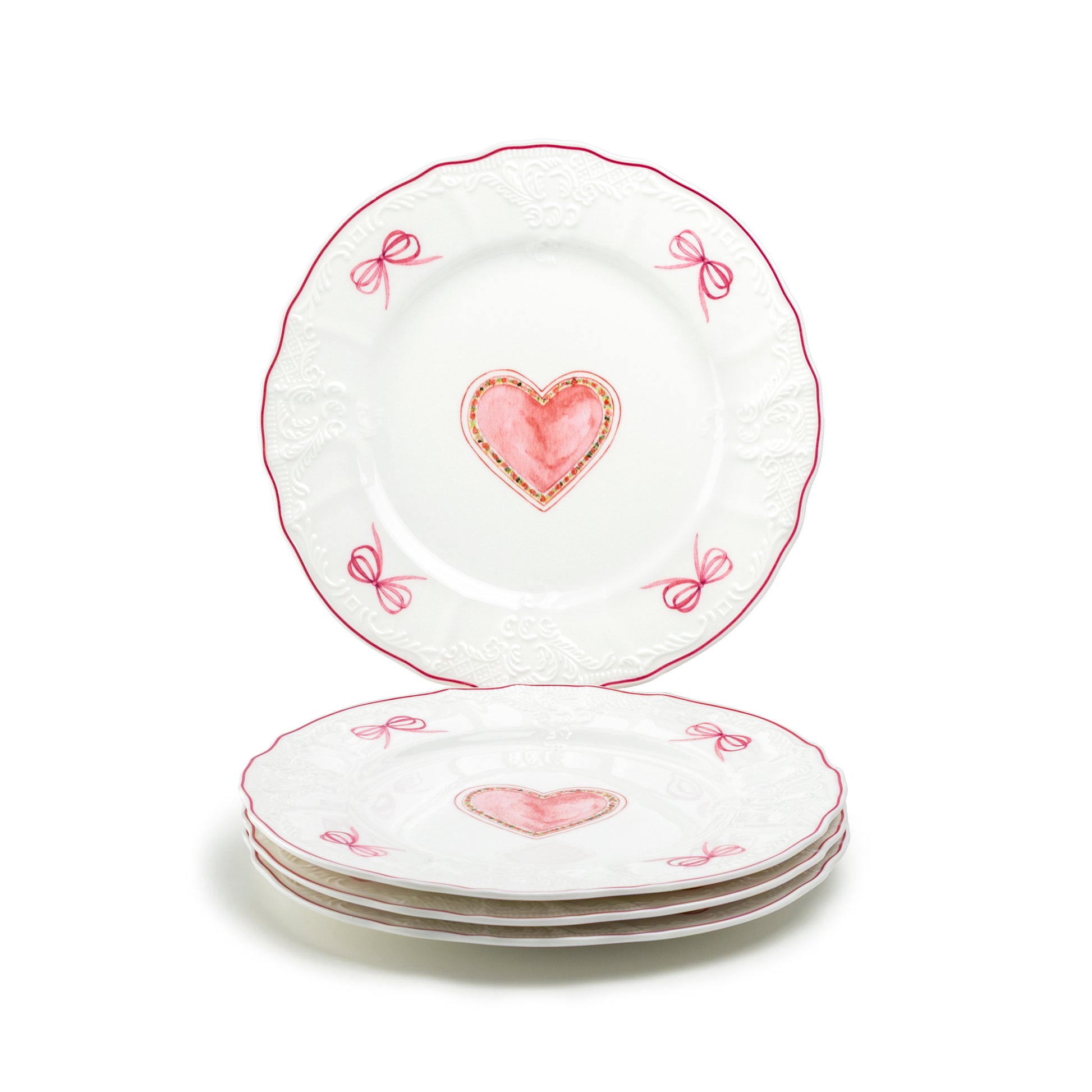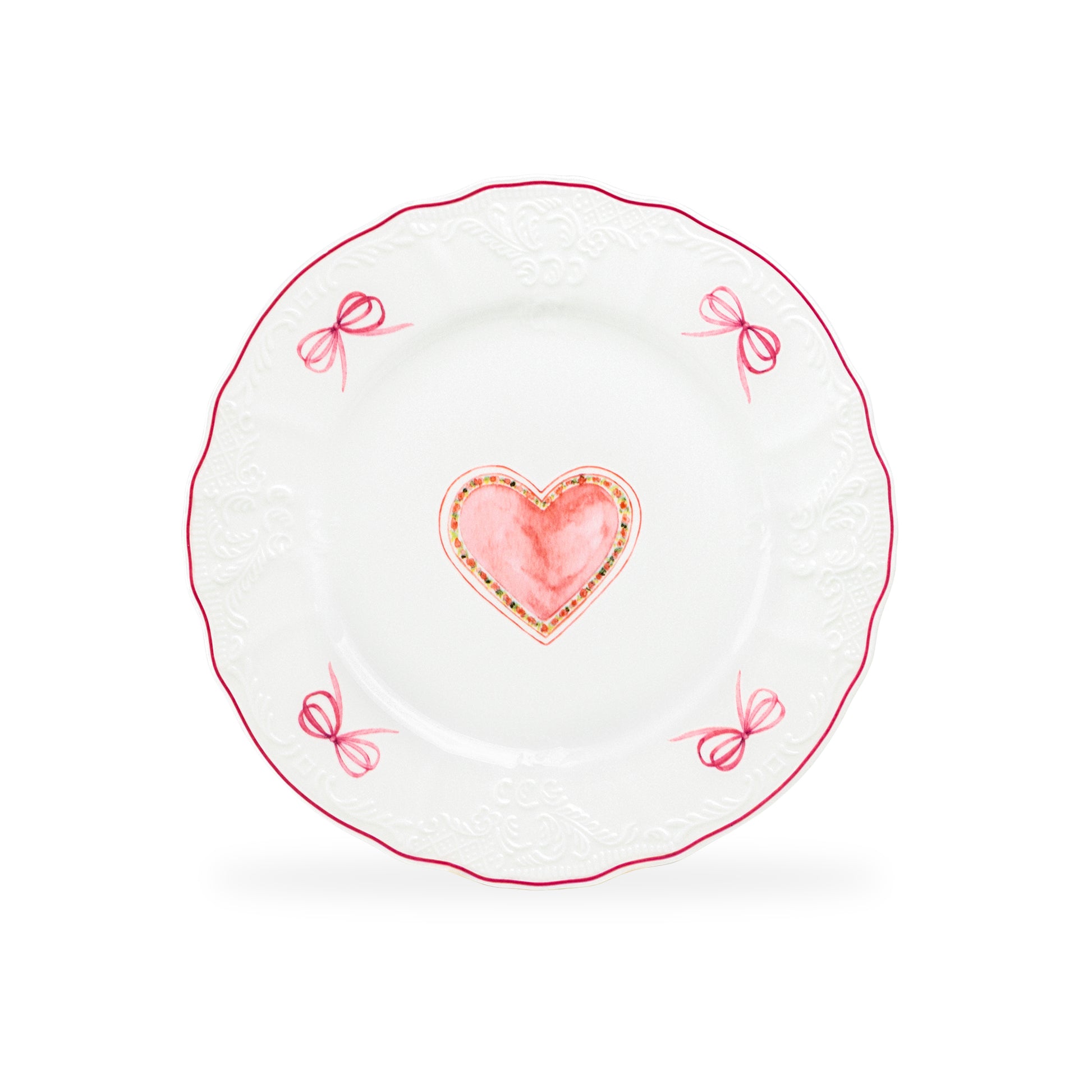 The Pink Ribbon Heart Scallop Dessert/Salad Plate features a soft white base accented with an elegant scalloped edge, delicate pink ribbon bows, and a hand-painted style heart at the center framed in warm blush tones. Subtle embossed detailing adds texture and charm, while the pink rim provides a refined finishing touch.