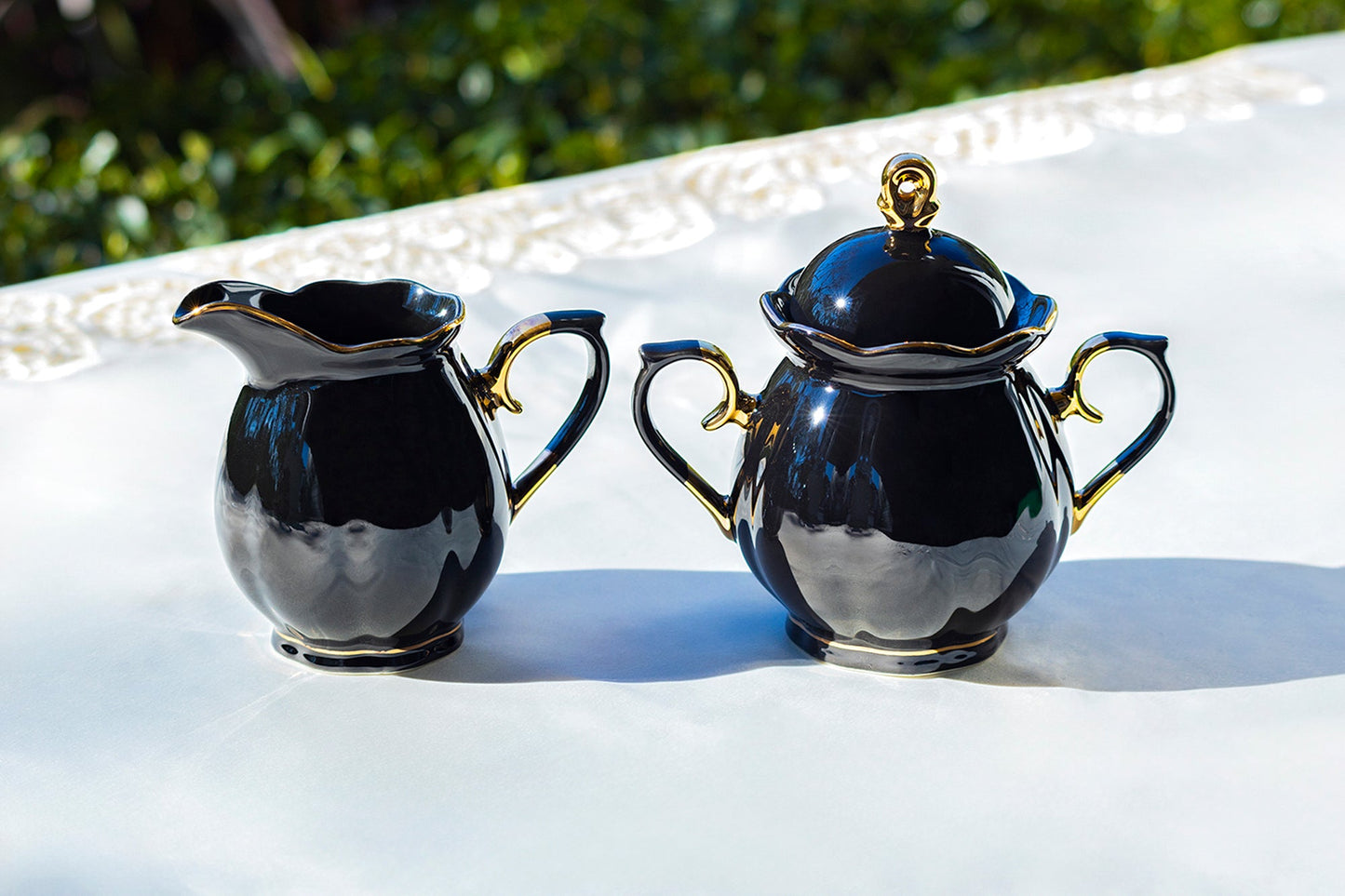 Black Gold Teapot + Sugar Creamer + 4 Spider Black Gold Luster Tea Cup and Saucer Sets