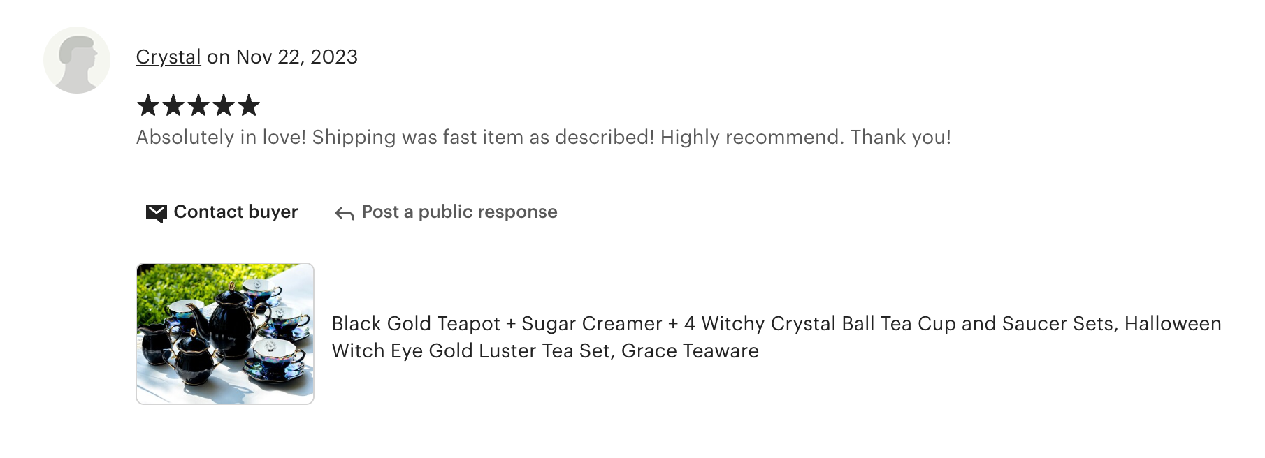 Black Gold Teapot + Sugar Creamer + 4 Witchy Crystal Ball Black Gold Luster Tea Cup and Saucer Sets