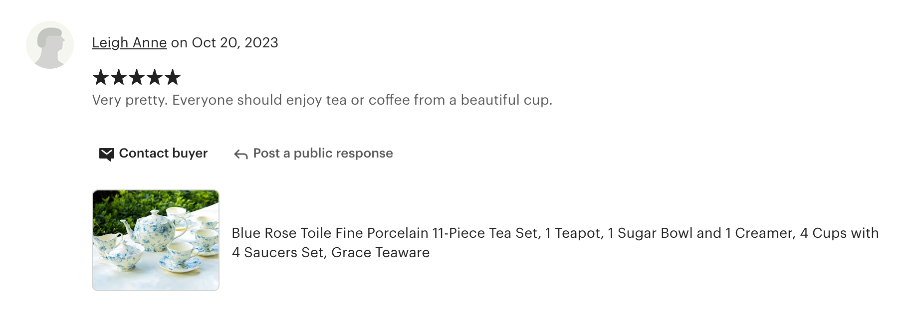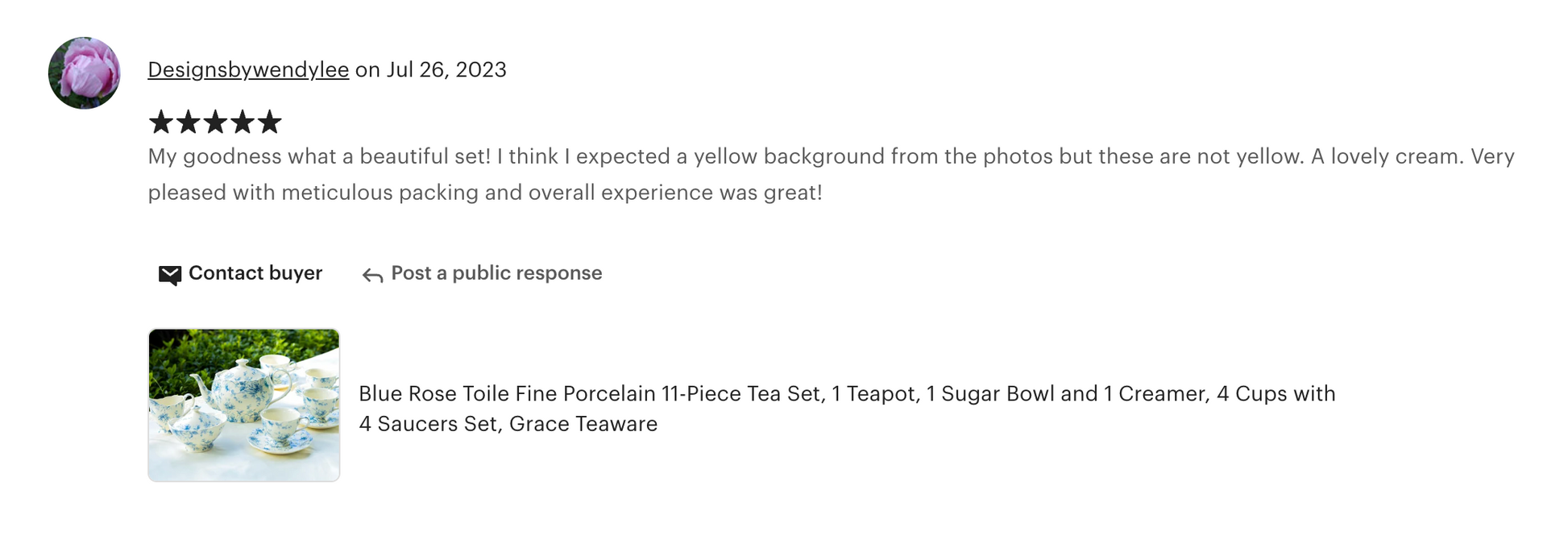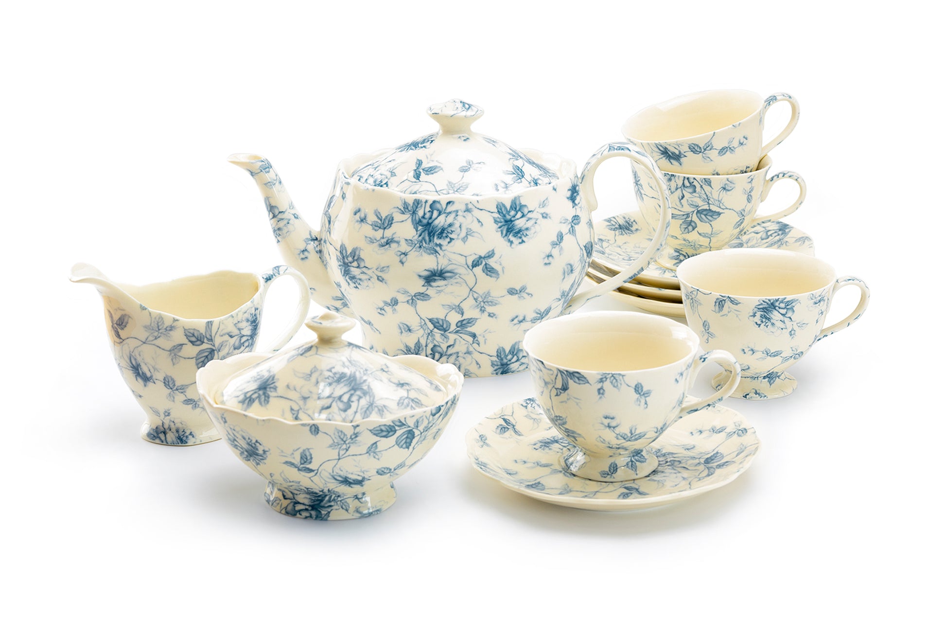 This tea set features the decal placed under the glaze. It has a base color of cream, rather than white. Each set includes - 1 teapot, 1 sugar bowl and 1 creamer, 4 cups with 4 saucers.