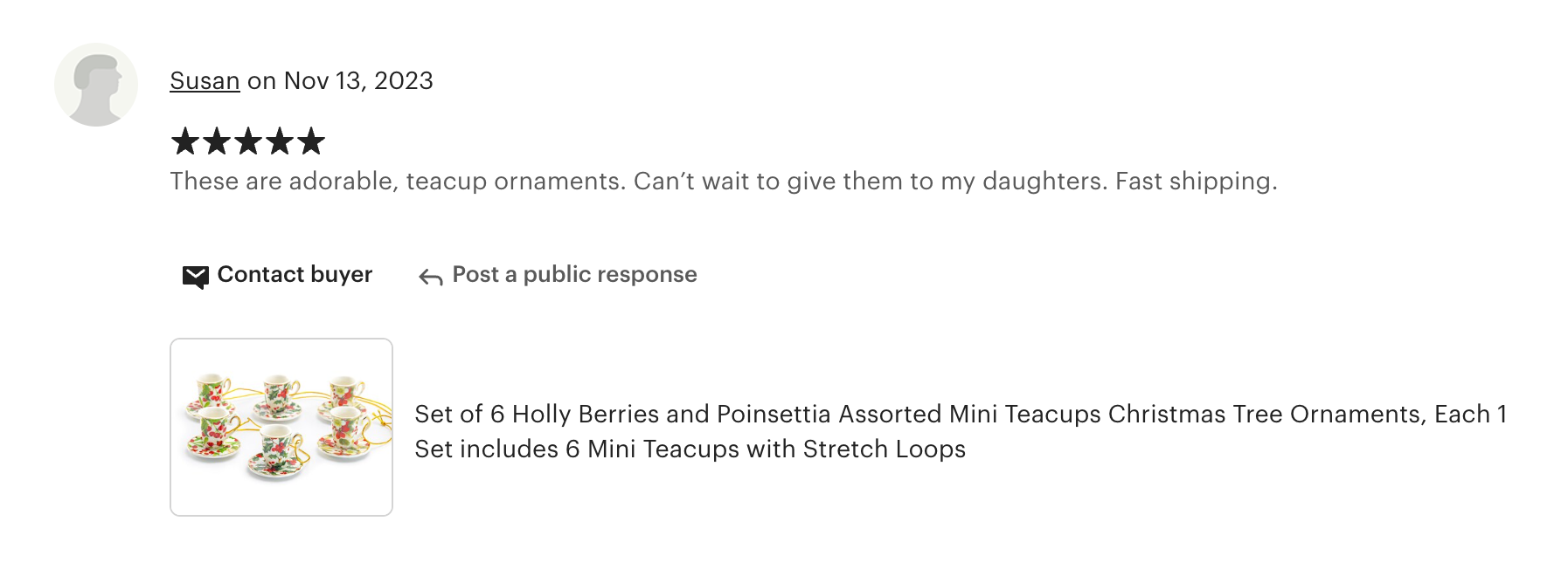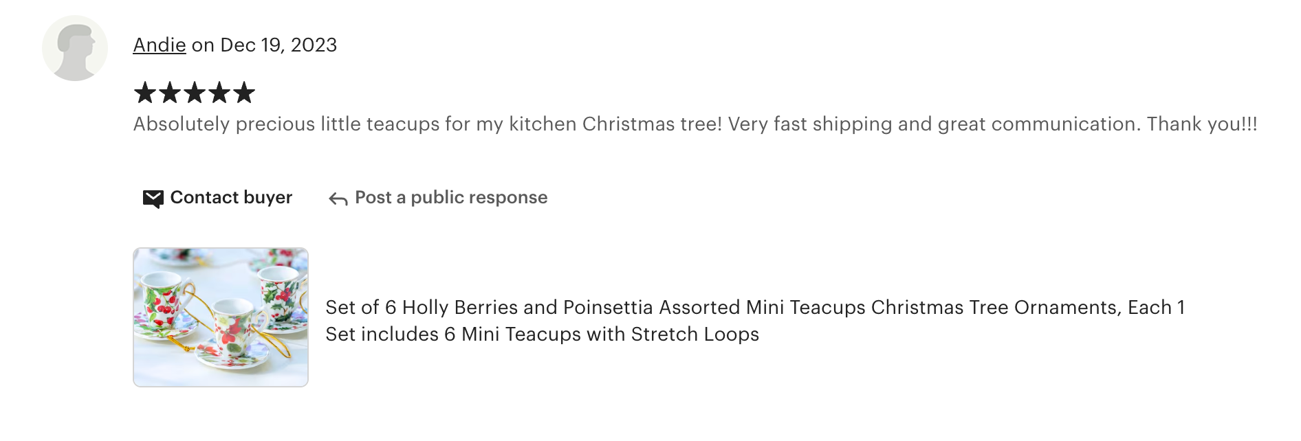 This ornament set is for Decoration Only. Each set includes - 6 assorted mini teacups with gold stretch loops. 3 designs, 2 for each design.