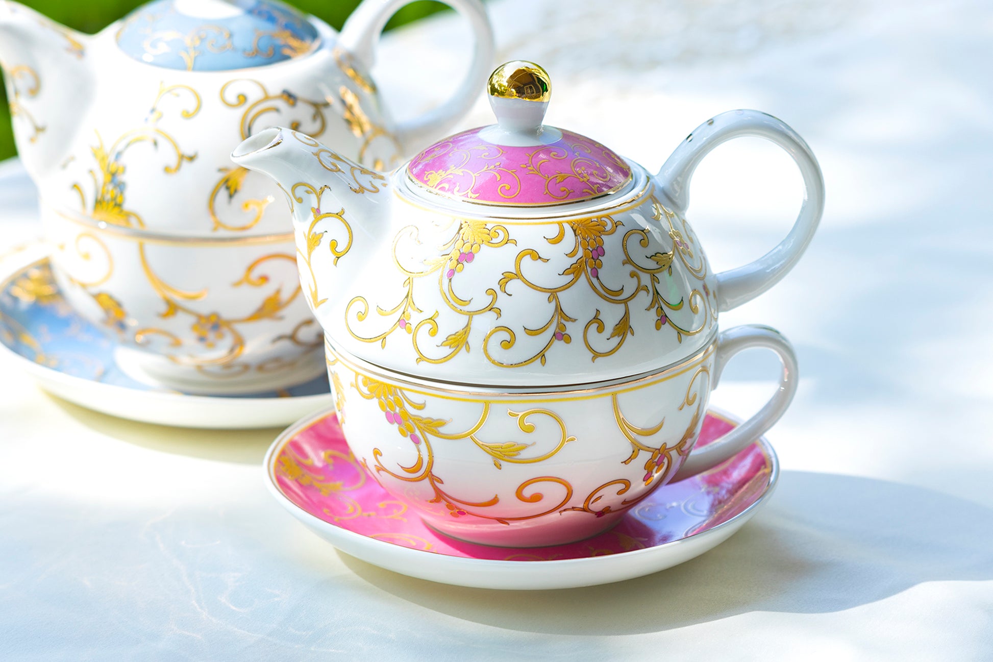Each set includes - 1 teapot, 1 cup with 1 saucer. As the gold trim is hand-painted, you may observe some slight variations in stroke and texture.