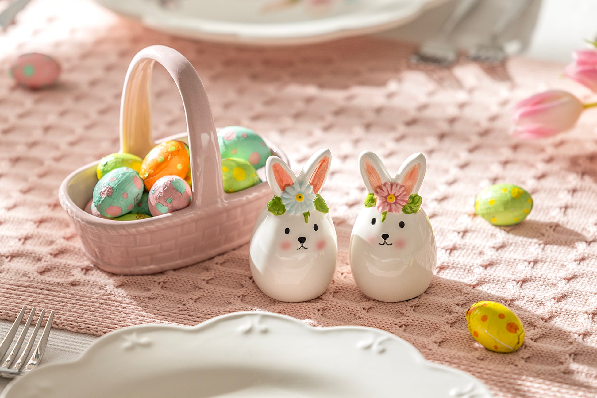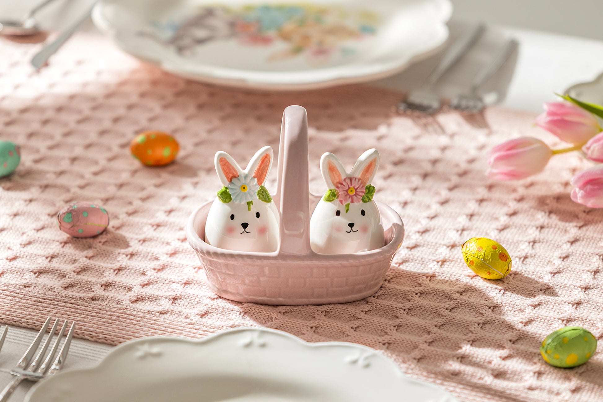 White Egg Bunnies with Pink Basket Ceramic Salt and Pepper Shaker Set