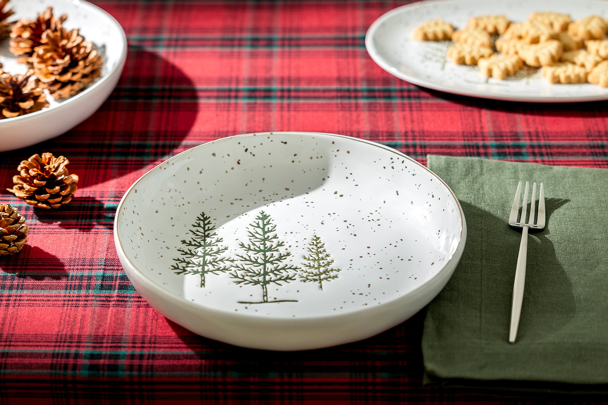 The Winter Pine Trees Pasta Bowl is a beautifully designed piece that captures the essence of the winter season with its engraved pine trees and delicate gold specks that add a festive sparkle. Perfect for serving pasta, salads, or any hearty dish, this bowl combines functionality with holiday charm.